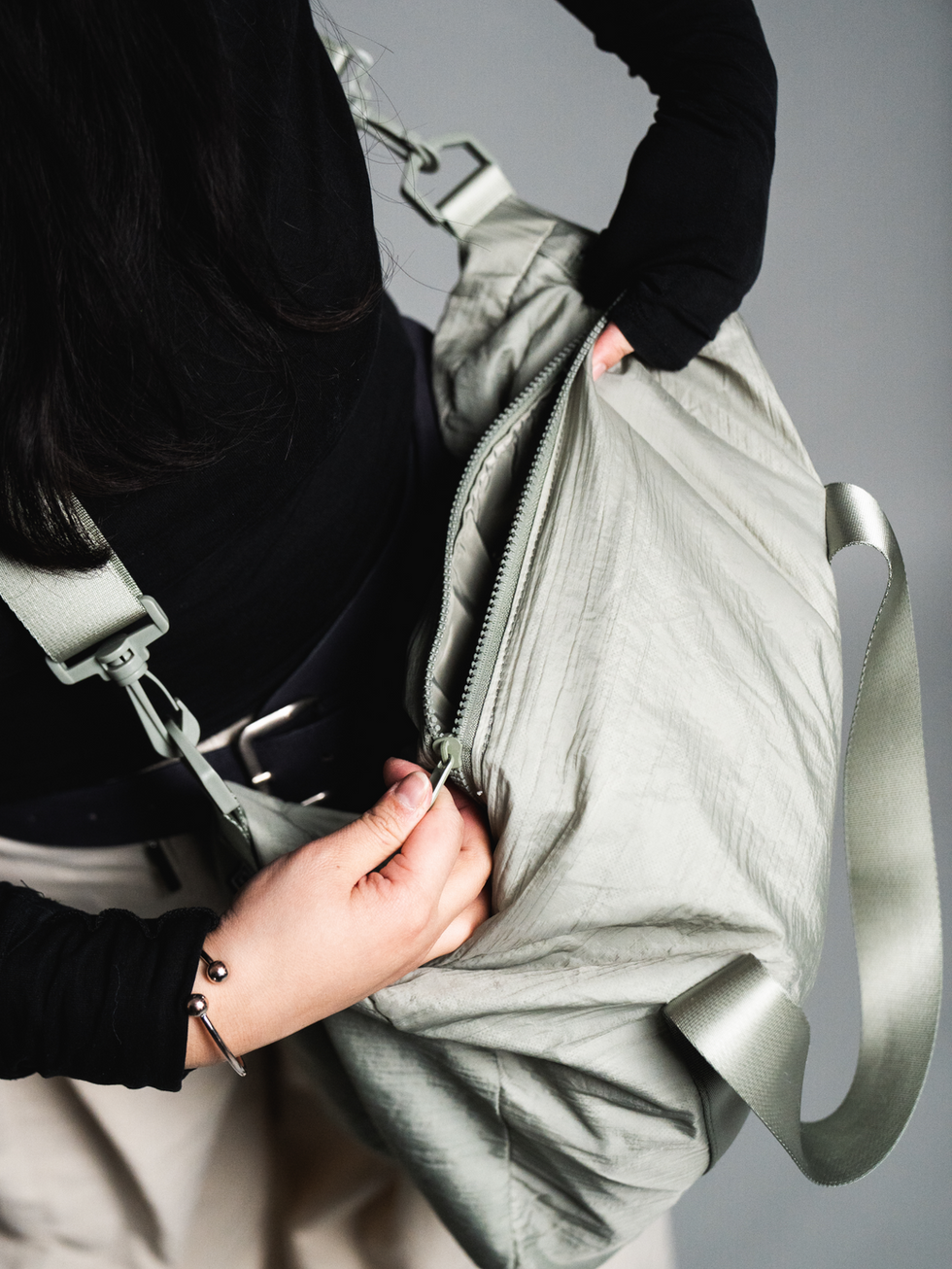 Zip closure and adjustable strap for crossbody wear.